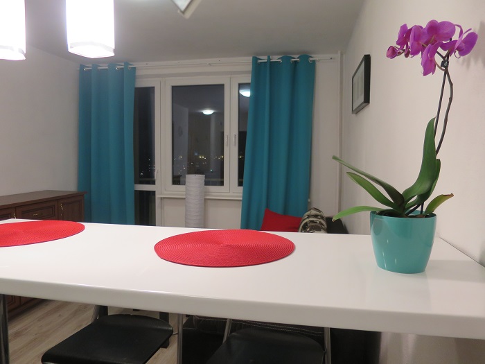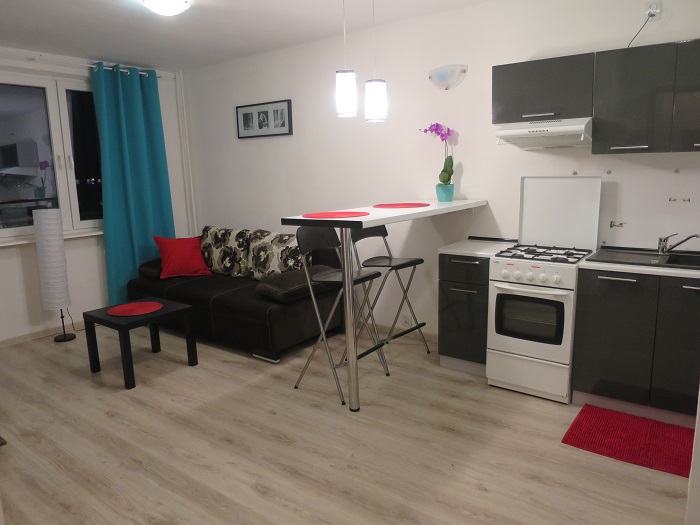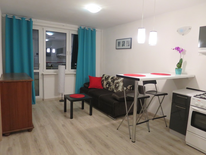 Apartament Turkusowy to dwupokojowe mieszkanie z balkonem o powierzchni 34 m2. Usytuowane na 8 pi??trze - w budynku z wind??.