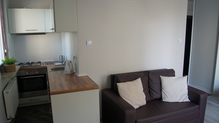 Składa się z pokoju połączonego z aneksem kuchennym, przedpokoju i łazienki.
